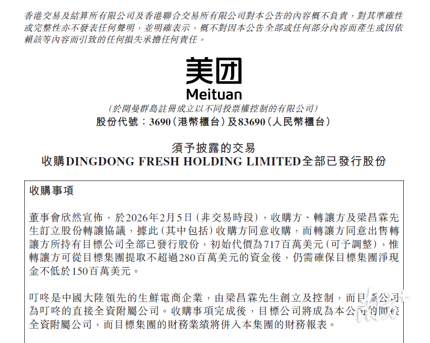 2月5日,美团于香港联交所发布公告,将以约7.17亿美元的初始对价,完成对叮咚买菜中国业务100%股权的收购。