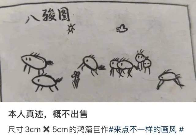一组名为“本人真迹,概不出售”的民间《八骏图》率先火爆出圈,一人带头、全员跟风,抽象的网友纷纷跟进晒“画作真迹”,并表示:“本人真迹,概不出售!”每一幅都出乎意料→@广州青年