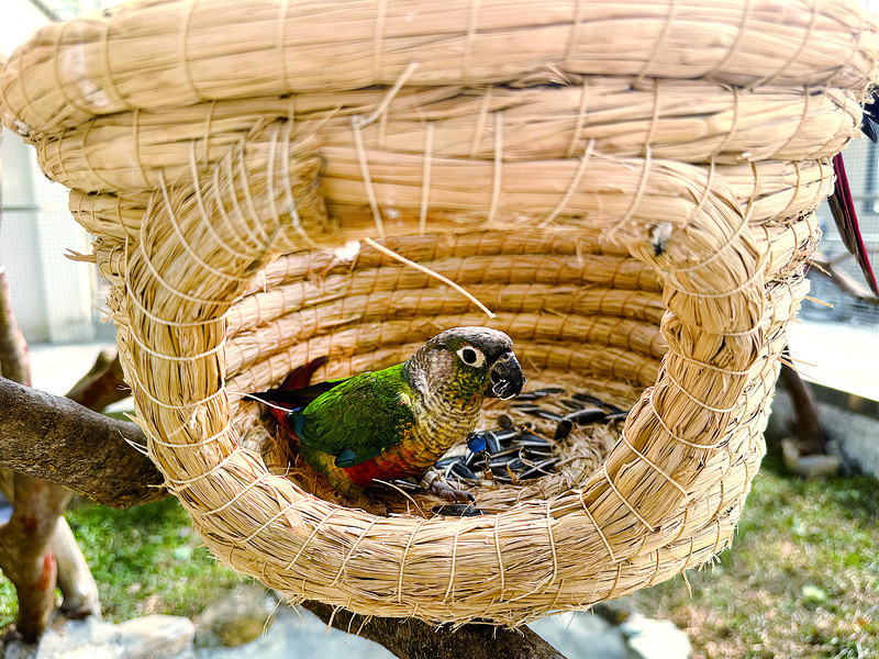 针对怕寒的热带鹦鹉,工作人员利用稻草、纸箱等材料制作了多个保暖鸟窝,内置食物,引导鹦鹉进入避风保暖;对大型禽类笼舍,加装防风罩,科学预留通风口,确保空气流通、防止潮湿。在兽类区域,工作人员在笼内铺设了干燥柔软的稻草垫料,安置了木质避寒箱,部分笼舍还增设了保温灯,最大限度减少寒风对动物的侵袭。