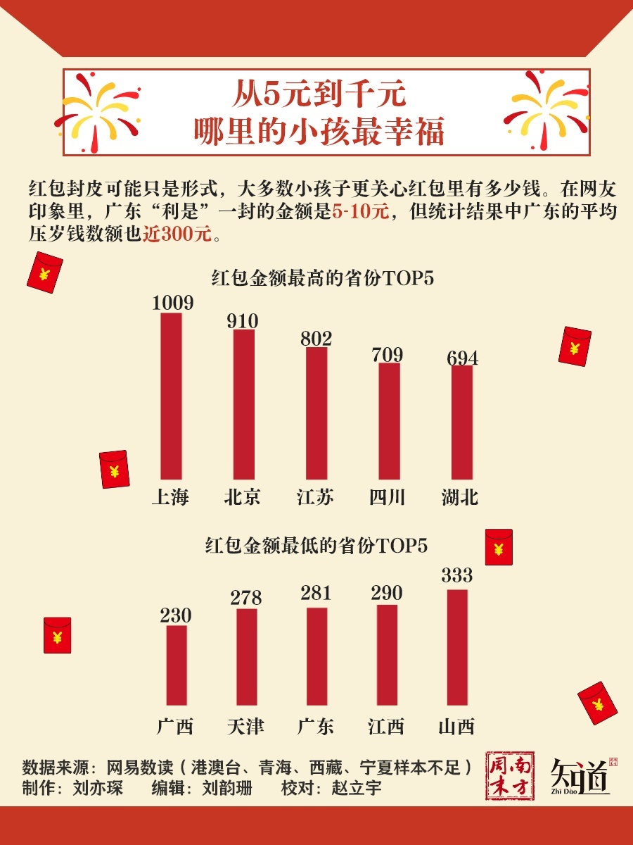 不过,据统计结果显示,广东人也并非如此“小气”。广东红包金额平均281元,甚至略高于一向被认为注重人情往来的天津——278元。