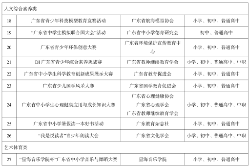 本次通过评审的全省竞赛活动分为自然科学素养类、人文综合素养类、艺术体育类三大类。共有包括广东省计算机学会、广东省航空航天学会、广东省电子学会等16个单位获得2025—2028学年面向中小学生的全国性竞赛活动广东省办赛授权。