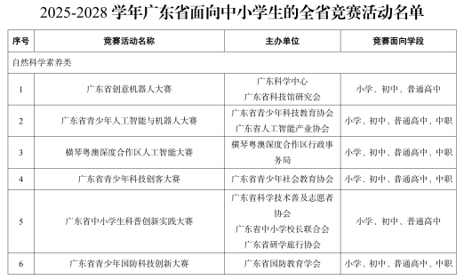 附:2025—2028学年广东省面向中小学生的全省竞赛活动名单