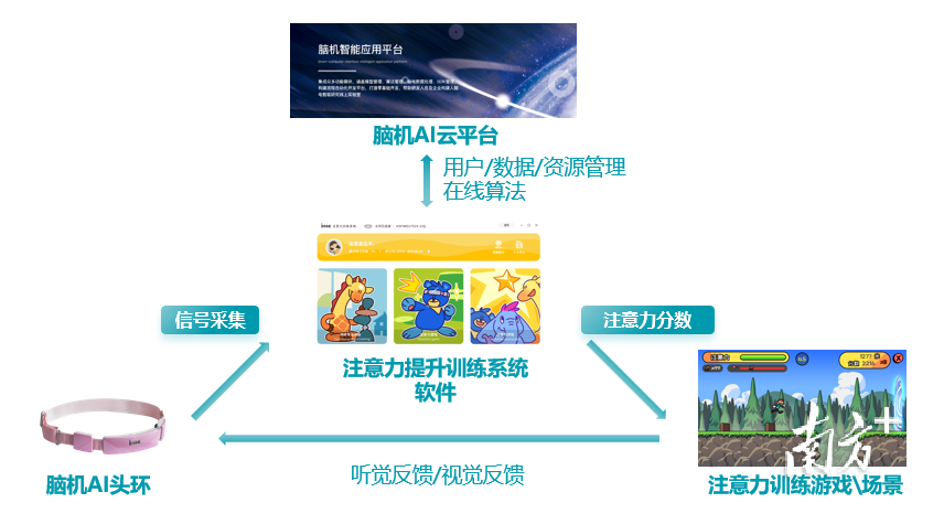 该方案创新打造了亲子互动的训练模式,还设计了便携的脑机AI头环,能精准捕捉孩子的脑电波信号,再通过AI云端系统把脑电信号解码参与趣味游戏,比如用脑控力玩跑酷、拔河,让孩子在游戏中锻炼专注力。