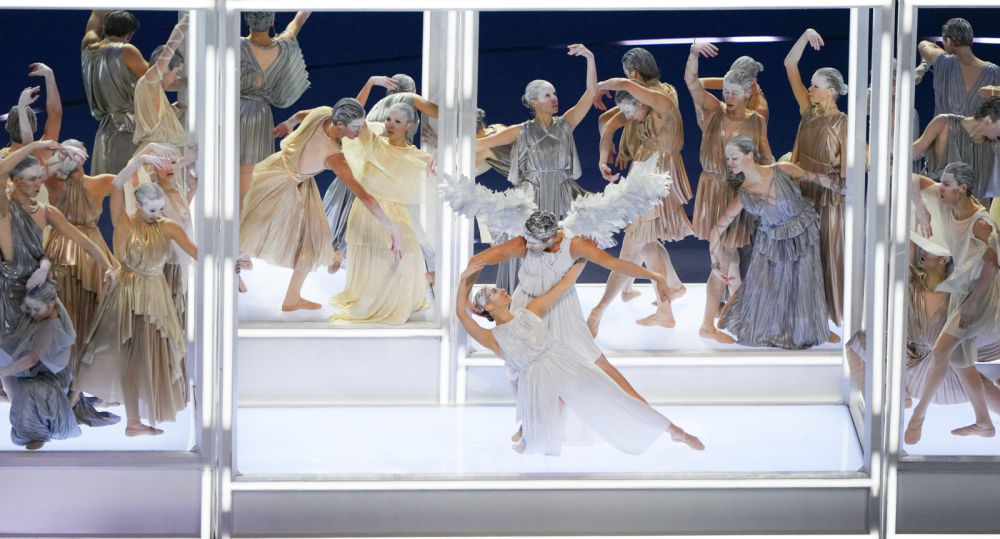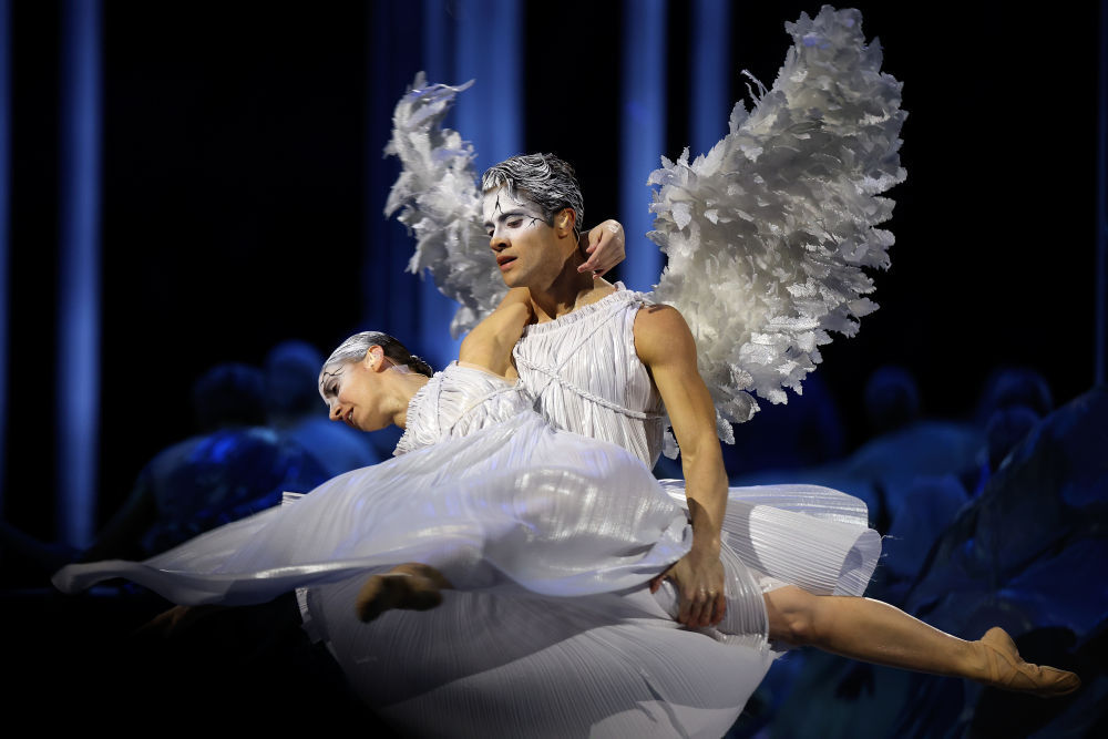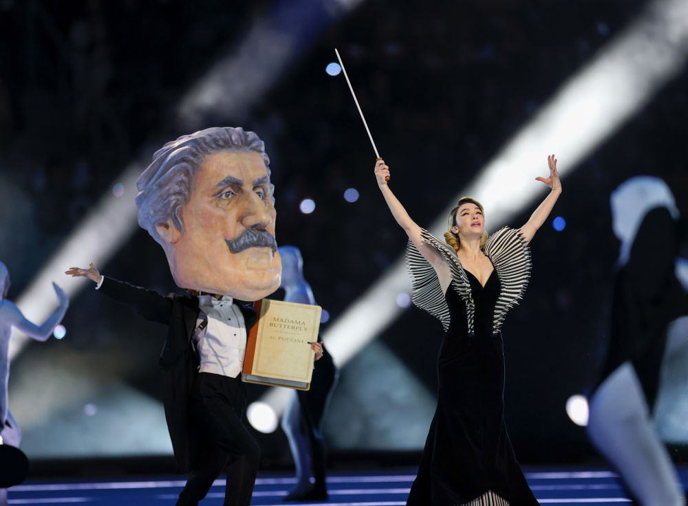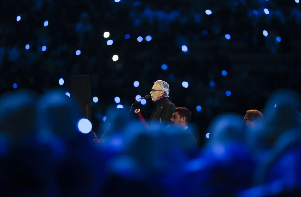↑意大利歌手安德烈·波切利在开幕式上表演。
