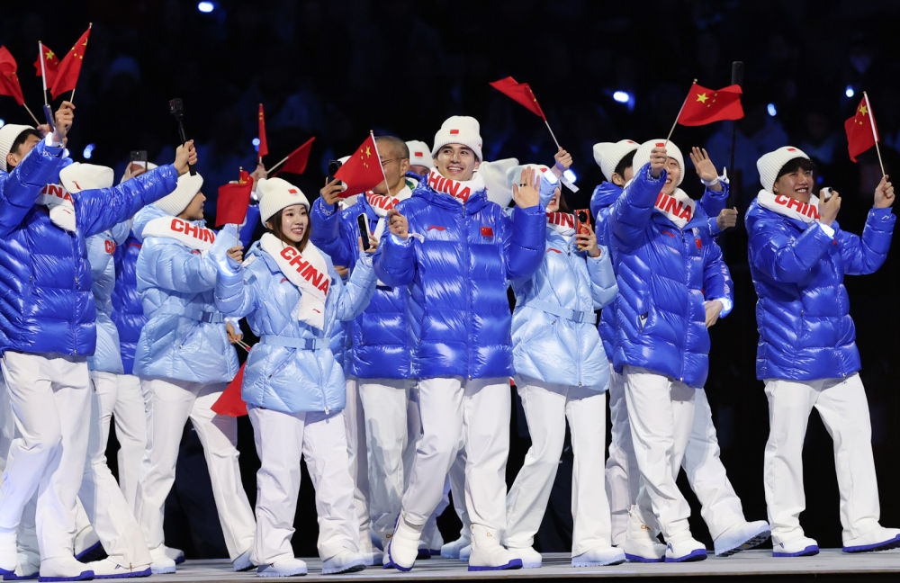 ↑中国体育代表团在开幕式上入场。