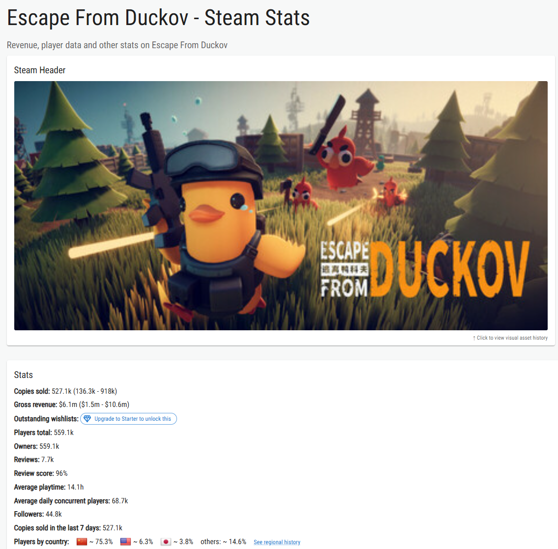 根据B站方面提供给南都N视频记者的信息,《逃离鸭科夫》项目立项于2022年底,当时的核心团队为4人,之前发过的独立游戏《碳酸危机Soda Crisis》和《蛇行武装Snake Force》,在Steam上都是“好评如潮”,属于有较强开发经验的团队。