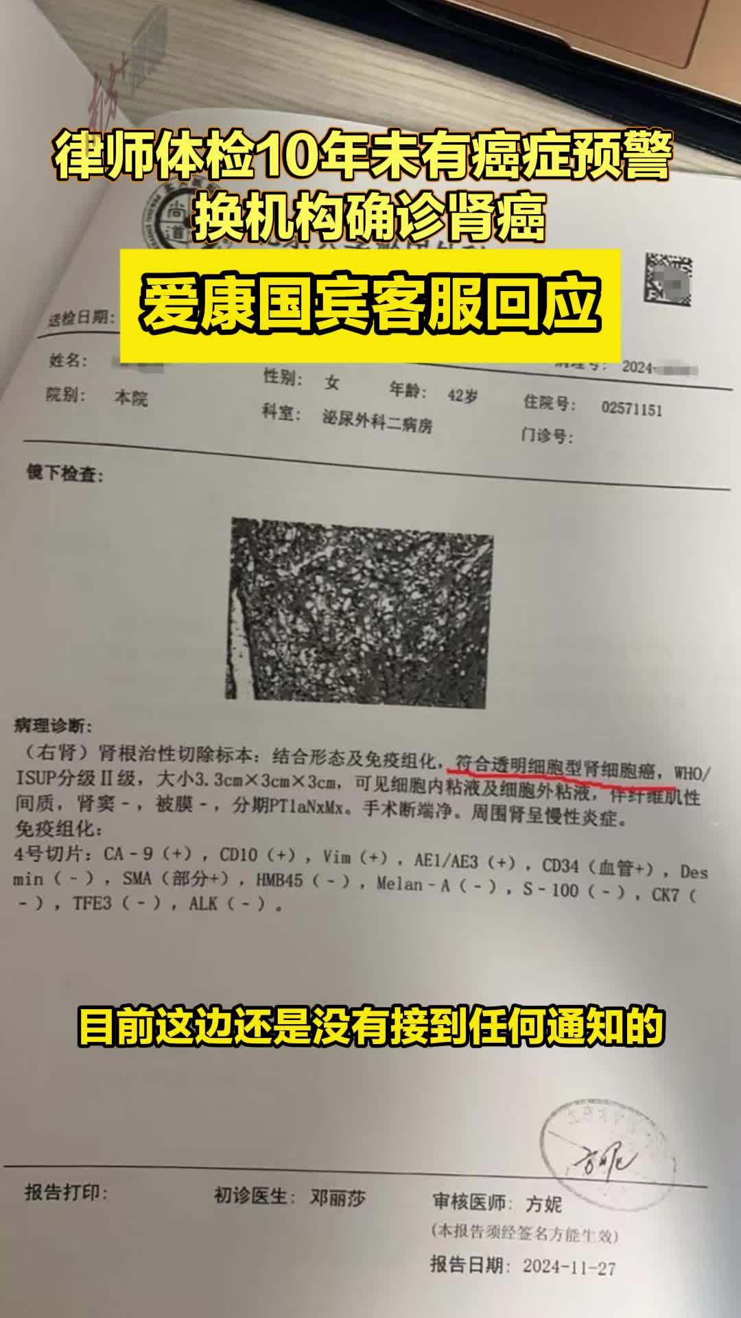律师体检10年未提示患癌风险,换机构确诊肾癌?爱康国宾客服回应
