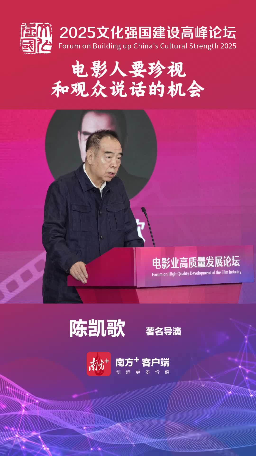 5月27日,2025文化强国建设高峰论坛电影业高质量发展论坛在深圳国际会展中心举行。著名导演陈凯歌作为本次论坛最后一位发言嘉宾,以他创作的《志愿军》三部曲为引,分享了新主流电影的创作经验。