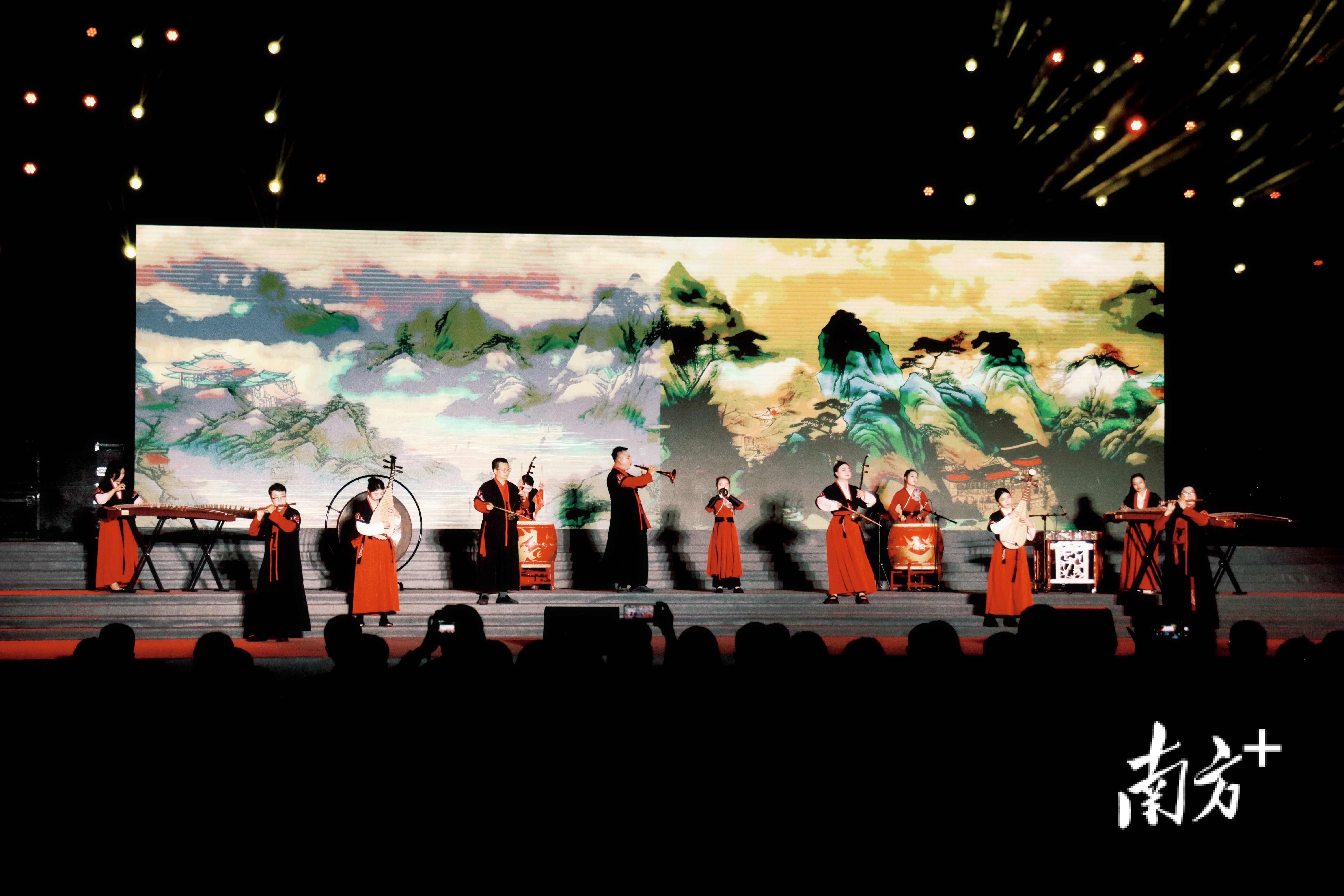 其中,新民乐演奏是一大亮点。由雅美民乐团担纲演奏的新民乐,以中国鼓为骨、唢呐为魂,二胡、古筝、扬琴、琵琶等乐器交相辉映,演绎《凤鸣岭南》《破晓之光》《破阵乐》《虎门之门》《虎魄·西行》《战弦铮鸣》等原创及改编曲目,乐声澎湃激荡。