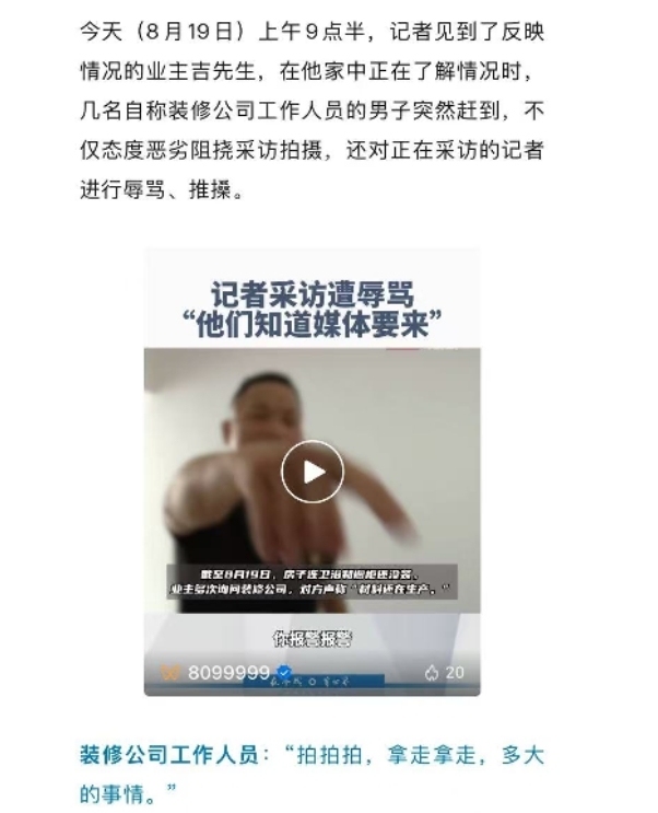 8月19日晚间,昆明广播电视台春城民生频道栏目官方微信发布消息称,当天上午10时,该频道栏目两名记者前往假日城市小区采访市民吉先生的装修纠纷,遭施工方辱骂推搡,不仅摄像机受损,而且女记者受伤。
