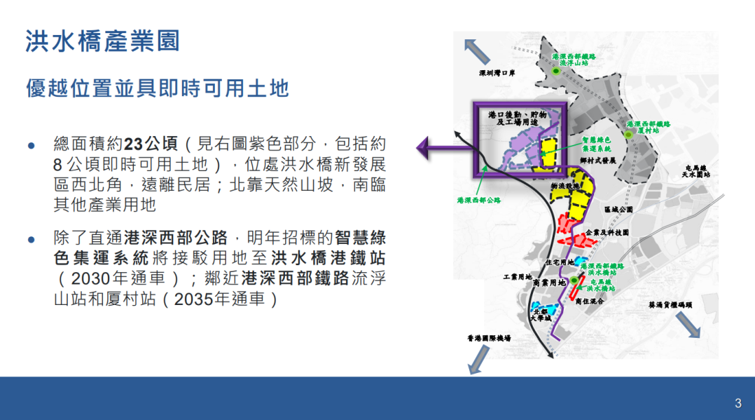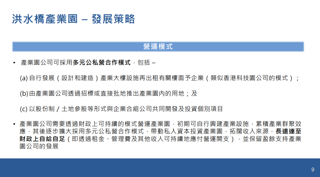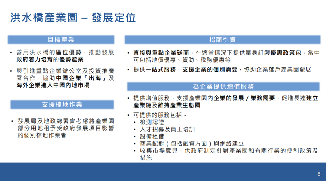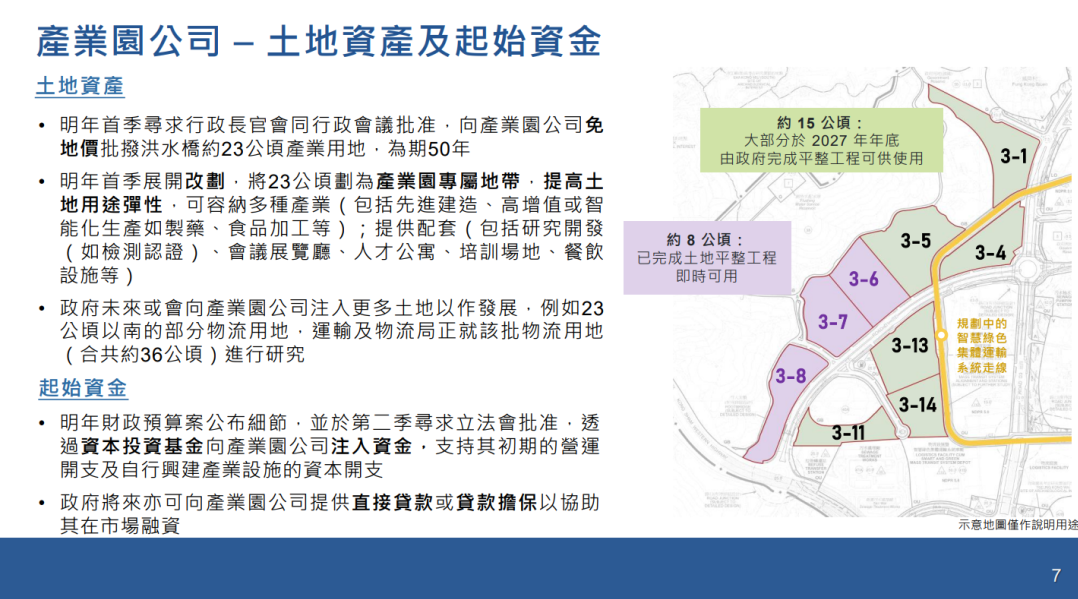 发展局稍后会提请行政长官会同行政会议,向产业园公司免地价批拨洪水桥约23公顷产业用地。发展局短期内会向城市规划委员会申请改划用地,为产业园订立专属地带,提高土地用途弹性,扩阔至涵盖不同合适产业和配套设施。