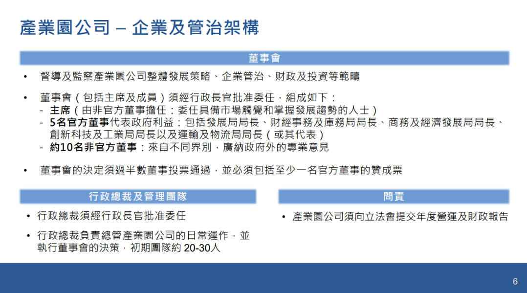 管治架构方面,产业园公司的董事局成员和行政总裁均须经行政长官批准委任。董事局由五位官方董事和约十位非官方董事组成,而主席会由非官方董事出任。五位官方董事由与产业园公司发展相关的政策局局长出任,分别为发展局局长、财经事务及库务局局长、商务及经济发展局局长、创新科技及工业局局长,以及运输及物流局局长。特区政府会透过官方董事直接参与产业园公司的重大决策。非官方董事则来自不同背景和界别,广纳政府以外的专业意见。