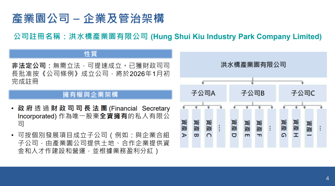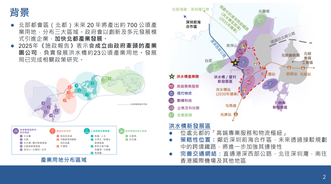 发展局公布成立洪水桥产业园有限公司(产业园公司),负责发展和营运位于北部都会区(北都)洪水桥约23公顷的产业园。目标2026年中投入运作。