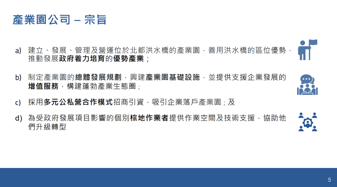 发展局局长甯汉豪表示,北都发展产业主导。除透过传统卖地、原址换地和片区开发引入产业,成立特区政府全资拥有的产业园公司是另一工具,让特区政府透过产业园公司参与产业建设和营运,发挥牵引作用,更好结合市场力量和运用公私营合作模式,加快推动北都产业发展。