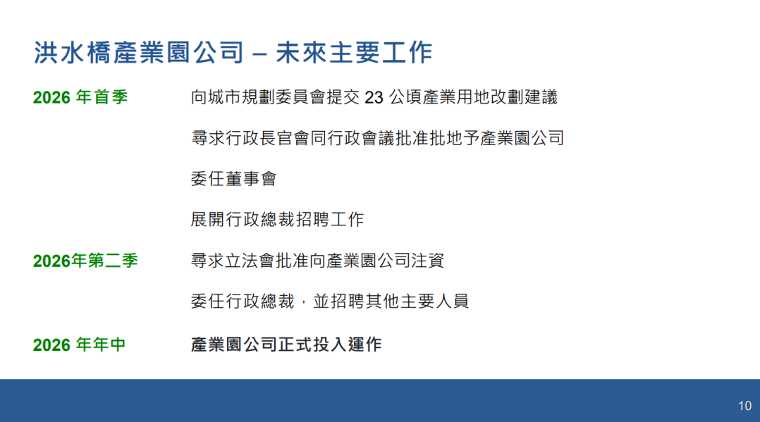 局方争取2026年1月启动公开招聘行政总裁的工作,并会赶紧在2026年上半年完成土地改划批拨、寻求拨款批准向产业园公司注资、委任董事局及行政总裁、招聘其他主要人员等一系列筹备工作,目标是令产业园公司可于2026年年中投入运作。