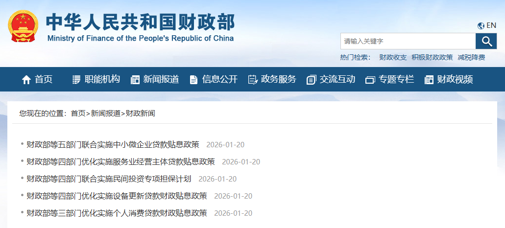 1月20日,财政部等5部门对外发布通知,明确实施中小微企业贷款贴息政策。政策支持范围为2026年1月1日起经办银行发放的、符合条件的中小微民营企业固定资产贷款和中小微企业参与项目使用的新型政策性金融工具资金,支持领域包括重点产业链及上下游产业、生产性服务业等。