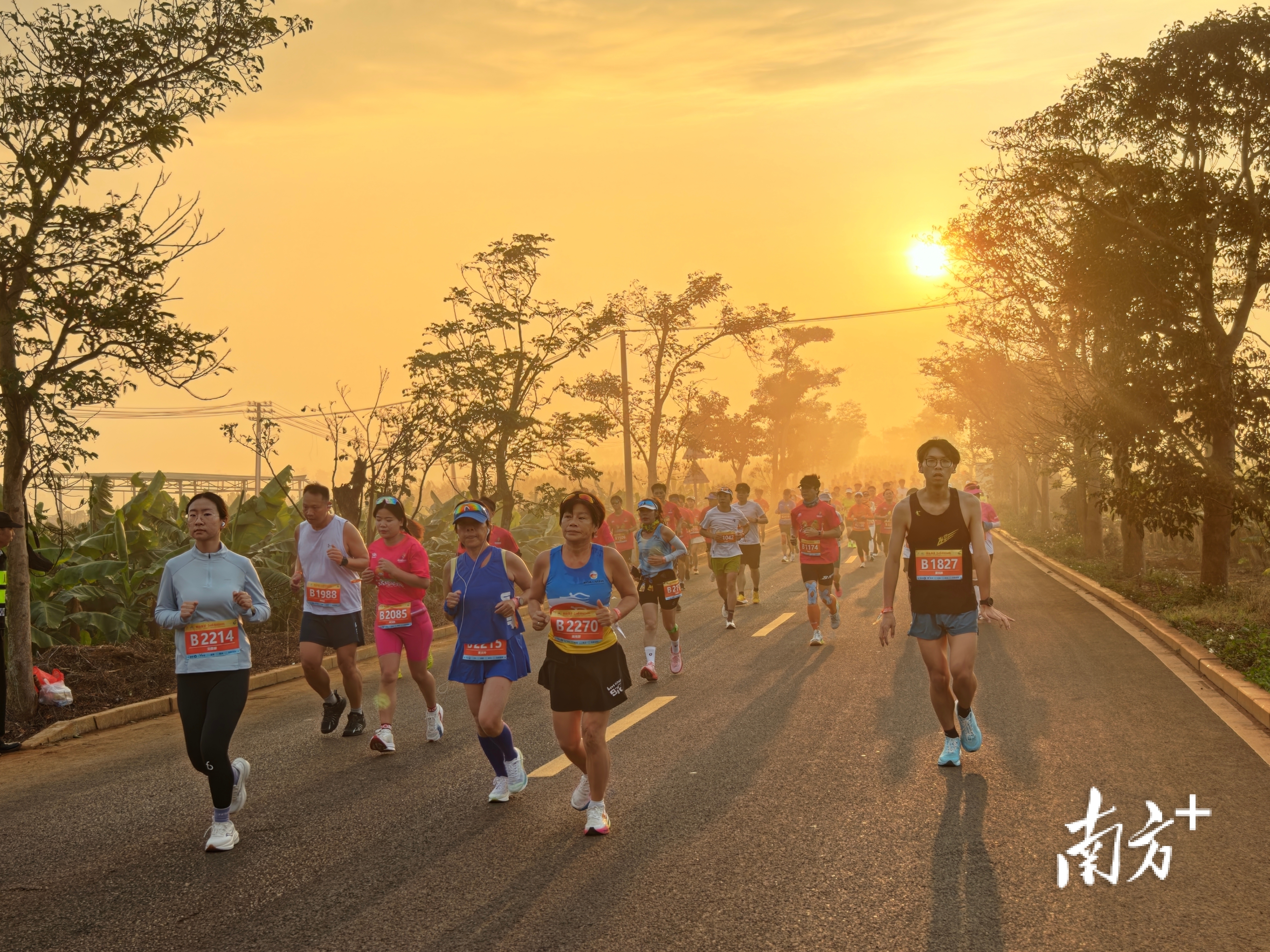 选手们沐浴在晨光中。