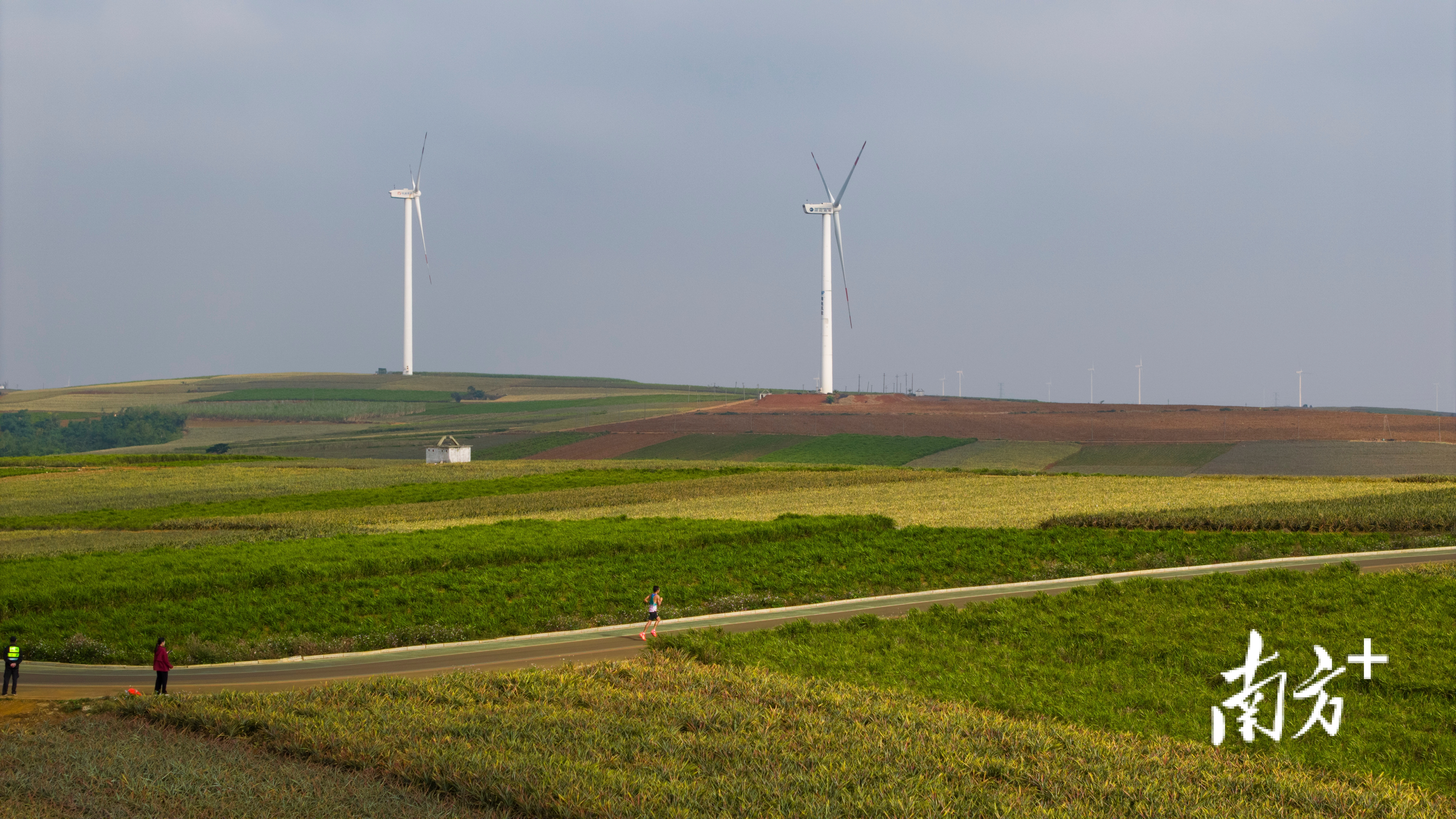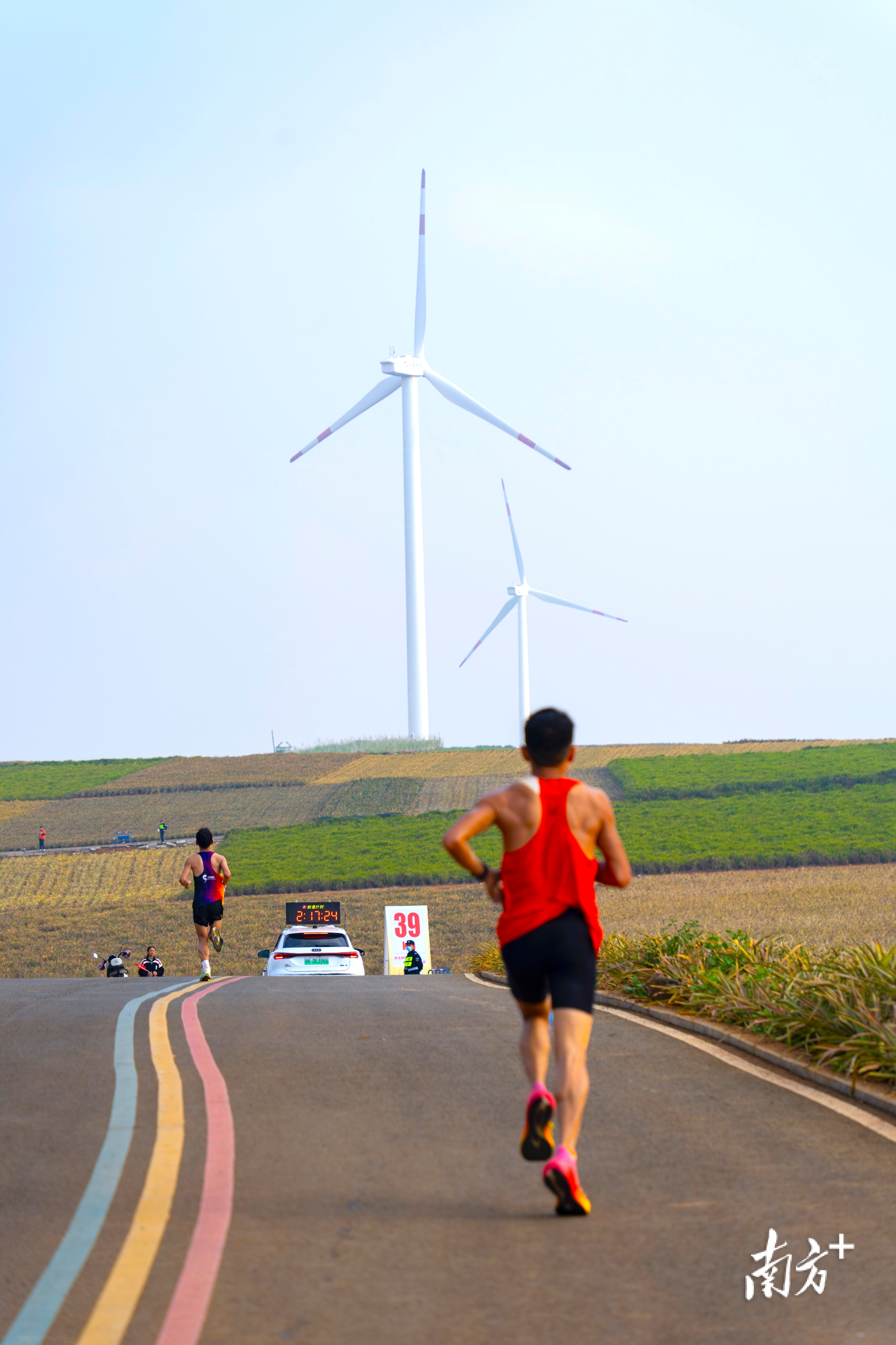 选手奔跑在巨大的风车和连绵的田园。