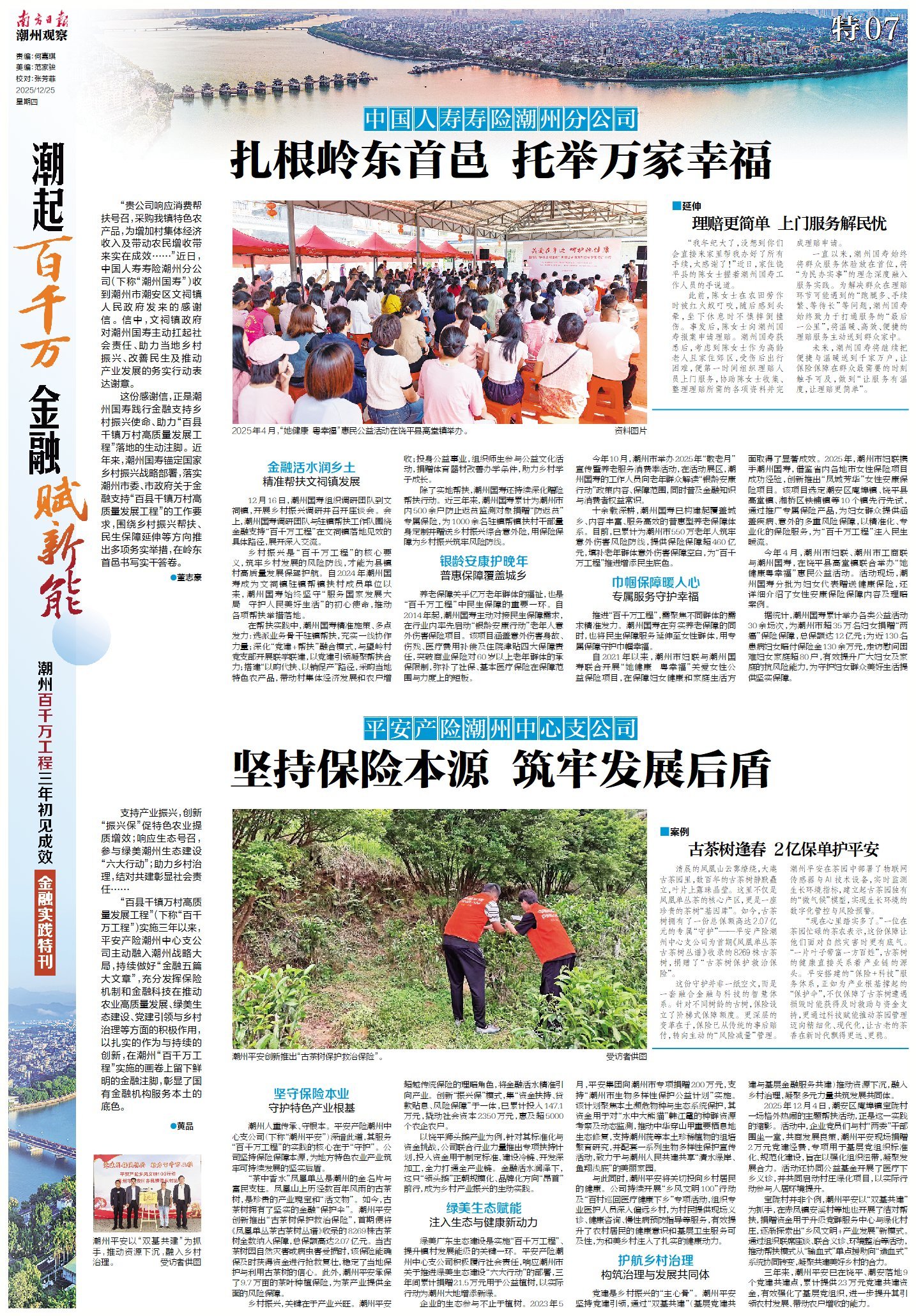 “百县千镇万村高质量发展工程”(下称“百千万工程”)实施三年以来,平安产险潮州中心支公司主动融入潮州战略大局,持续做好“金融五篇大文章”,充分发挥保险机制和金融科技在推动农业高质量发展、绿美生态建设、党建引领与乡村治理等方面的积极作用,以扎实的作为与持续的创新,在潮州“百千万工程”实施的画卷上留下鲜明的金融注脚,彰显了国有金融机构服务本土的底色。详情