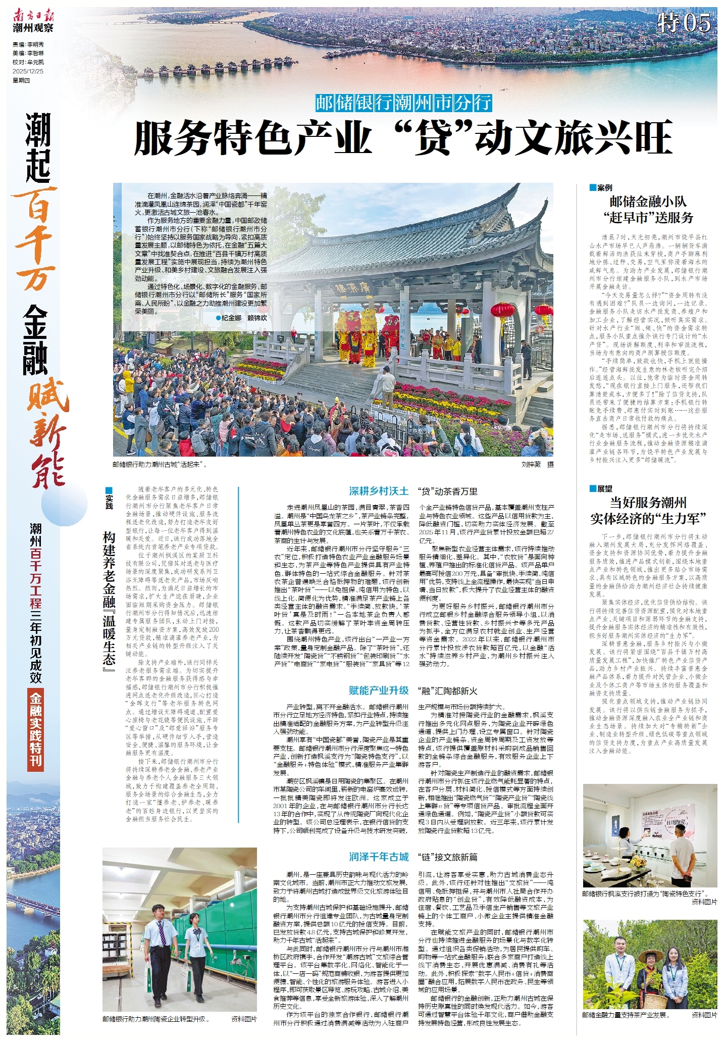 作为服务地方的重要金融力量,中国邮政储蓄银行潮州市分行(下称“邮储银行潮州市分行”)始终坚持以服务国家战略为导向,紧扣高质量发展主题,以邮储特色为依托,在金融“五篇大文章”中找准契合点,在推进“百县千镇万村高质量发展工程”实施中展现担当,持续为潮州特色产业升级、和美乡村建设、文旅融合发展注入强劲动能。详情