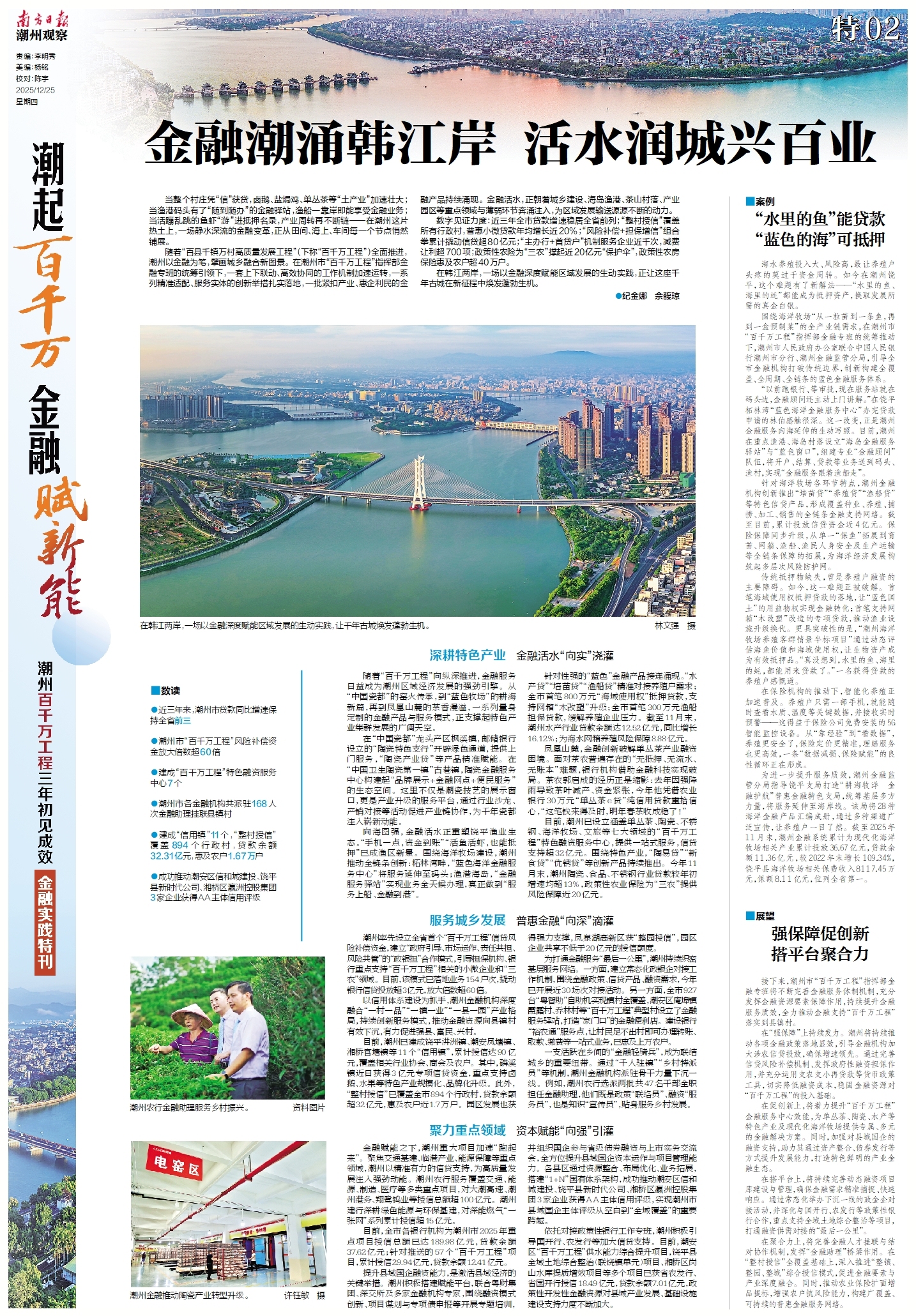 潮起山海,金融润野。从“沉睡资产”的唤醒,到“数字信用”的画像;从“木改塑”的贷款支持,到覆盖水稻全生命周期的风险保障;从一部手机管理整个渔场,到一个驿站服务整片乡村——在潮州,金融不再是遥远的概念,而是可感可及的及时雨、护身符、助推器。它流淌在窑火传承的匠心间,跳跃在乘风破浪的渔船上,扎根在稻浪翻滚的沃野中,更融入了寻常巷陌的烟火日常。
