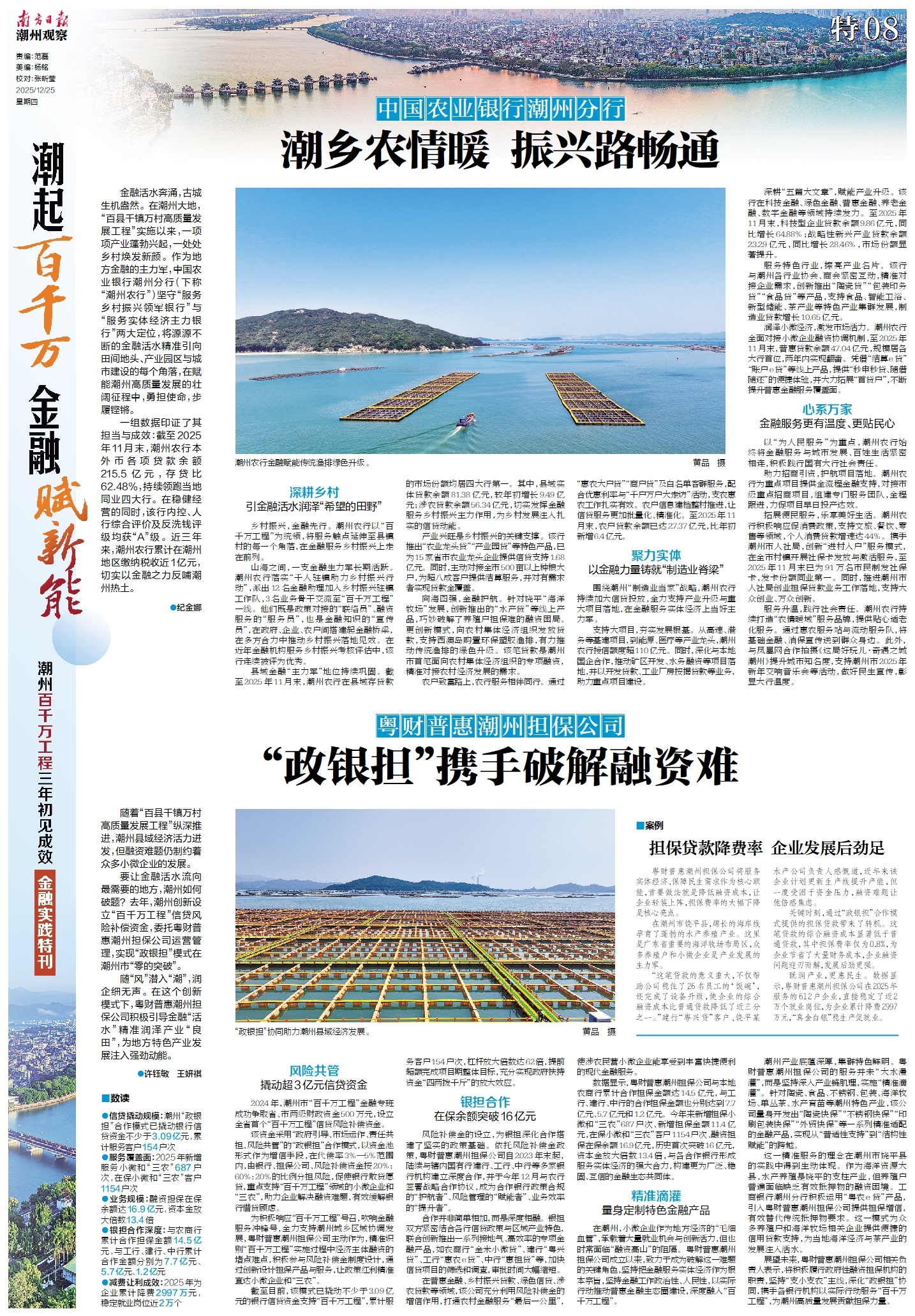 要让金融活水流向最需要的地方,潮州如何破题?去年,潮州创新设立“百千万工程”信贷风险补偿资金,委托粤财普惠潮州担保公司运营管理,实现“政银担”模式在潮州市“零的突破”。
