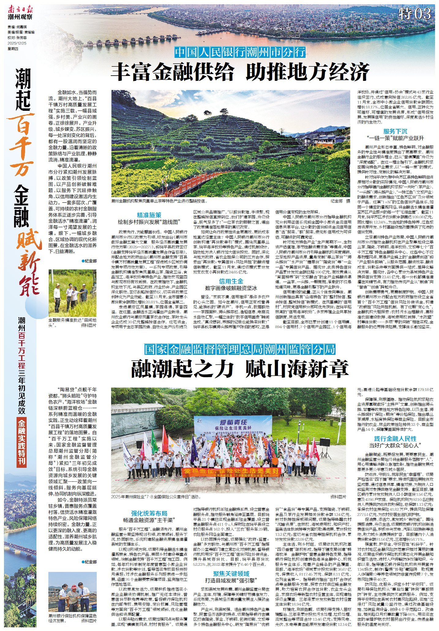 “陶易贷”点靓千年瓷都,“狮头鹅险”守护特色农产,“海洋牧场”金融链深耕蔚蓝粮仓……一系列精准而温暖的金融实践,正生动诠释着潮州“百县千镇万村高质量发展工程”的落地图景。自“百千万工程”实施以来,国家金融监督管理总局潮州监管分局(简称“潮州金融监管分局”)紧扣“三年初见成效”目标,系统引导金融资源向城乡发展的关键领域汇聚——政策向一线倾斜,服务向基层延伸,协同机制向纵深推进。详情