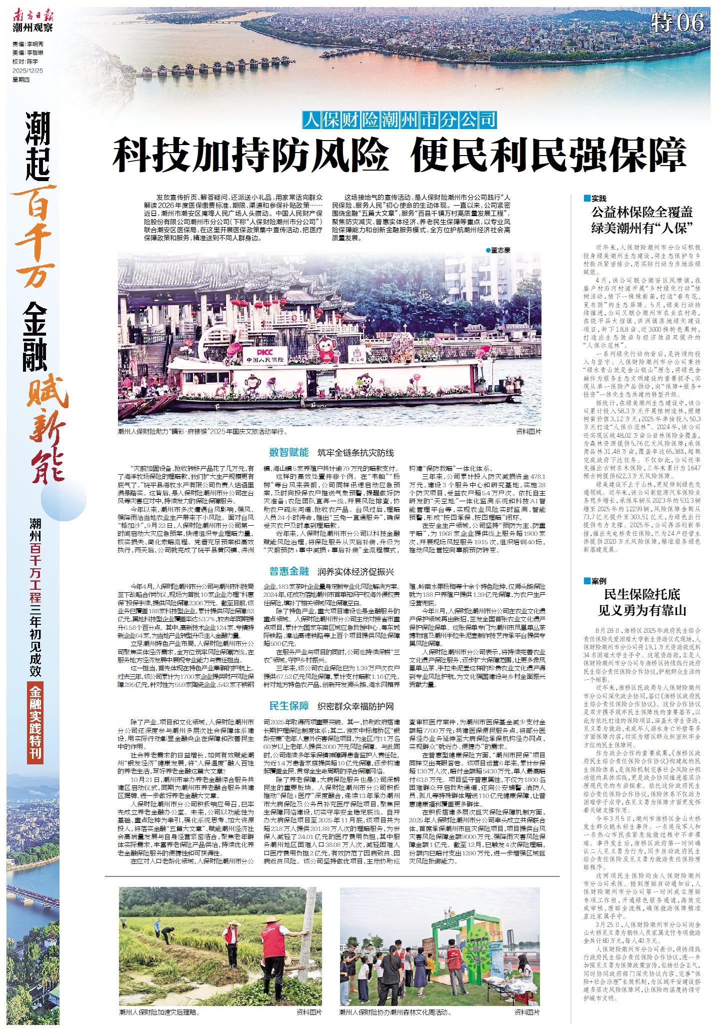 一直以来,人保财险潮州市分公司践行“人民保险、服务人民”初心使命,紧密围绕金融“五篇大文章”,服务“百县千镇万村高质量发展工程”,聚焦防灾减灾、普惠实体经济、养老民生保障等重点,以专业风险保障能力和创新金融服务模式,全方位护航潮州经济社会高质量发展。详情