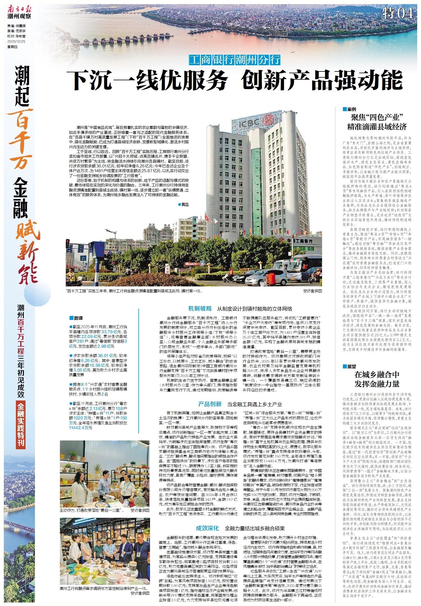 工于至诚,行以致远。回顾“百千万工程”实施历程,工商银行潮州分行紧扣省市相关工作部署,以“兴旺十大领域,点亮百镇名片,携手千企联盟,共促万村繁荣”为主线,将金融活水持续引向潮州各县镇村。截至目前,该行涉农贷款余额36.01亿元,较年初净增6.26亿元;今年已走访企业及个体户近万次,为1481户经营主体授信金额达25.87亿元,以扎实行动交出了一份金融支持城乡协调发展的“工行答卷”。详情
