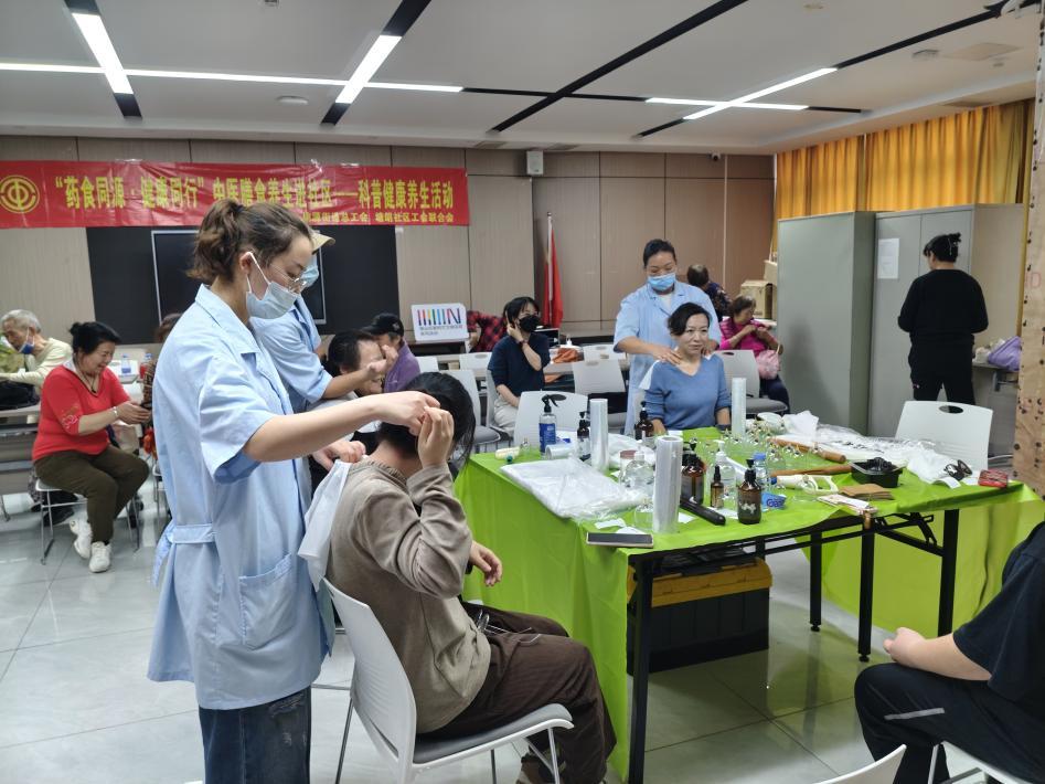 活动现场热闹非凡。中医把脉区域,经验丰富的中医师们耐心地为居民、职工把诊,仔细地感受脉象,询问日常症状与生活习惯,并给予职工个性化的养生指导,让大家对自身健康有了更清晰的认识。推拿艾灸体验区,专业理疗师们手法娴熟,精准地找到穴位进行推拿按摩,舒缓肌肉紧张与疼痛,艾灸的温热缓缓渗透,驱散身体的寒湿之气,居民、职工在体验过程中,对中医传统理疗的效果啧啧称奇。此外,中药膳食茶饮免费试喝区域也围满了人,工会工作人员精心准备了多种中药茶饮,如具有清热去火功效的菊花枸杞茶、可健脾祛湿的红豆薏仁茶等,居民、职工们一边品尝,一边听理疗师讲解茶饮的成分与养生功效,了解中药茶饮在日常保健中的妙用。