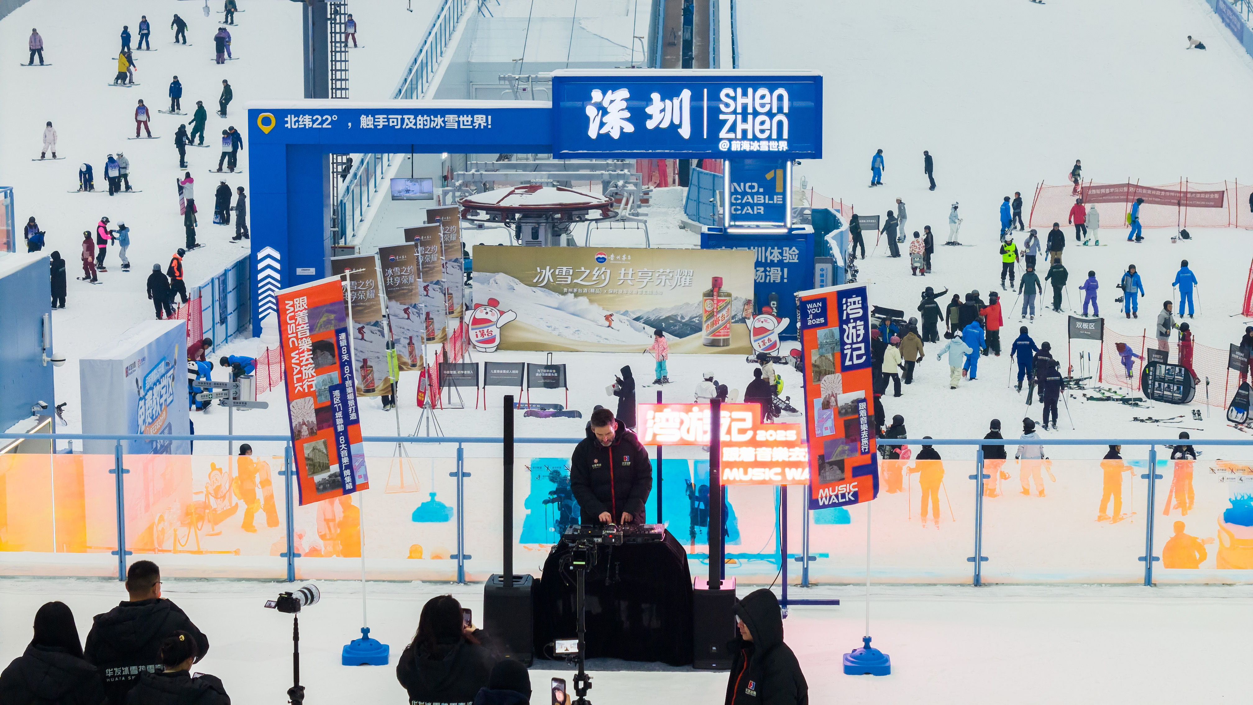 在700年的凤凰古村,由“金爵士”策划的演出现场,鼓手聂鑫与键盘演奏者邓珮彤带来的爵士二重奏,让即兴的旋律在百年古建的青砖黛瓦间流淌;在“湾区之眼”的观景平台,电子音乐人DJ伍(Loop Infinity) 用富有节奏感的电子乐,与开阔的城市景观形成独特的视听共鸣;在前海冰雪世界,Bedrock厂牌音乐人Stelios Vassiloudis在真实的冰雪环境中,演绎了具有空间穿透力的Techno音乐。
