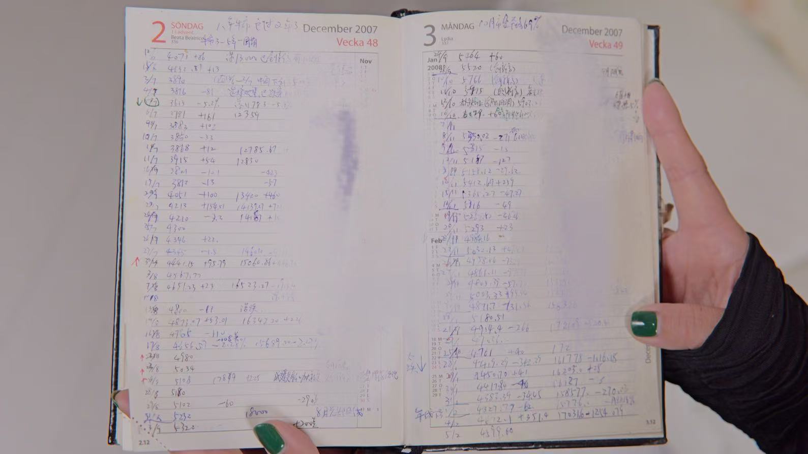 她有一个账本,里面记录着国库券行情、股票走势、外汇波动,还分析国内国际形势。谁能想到,一个老太太会这些。你知道吗?最逗的是她写的一行红色大字“我跑赢了GDP,真棒,加油!”,她太有趣了。