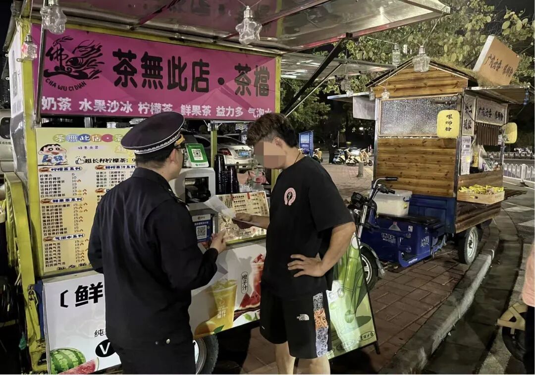 ▲执法人员向流动摊贩派发并讲解《倡议书》