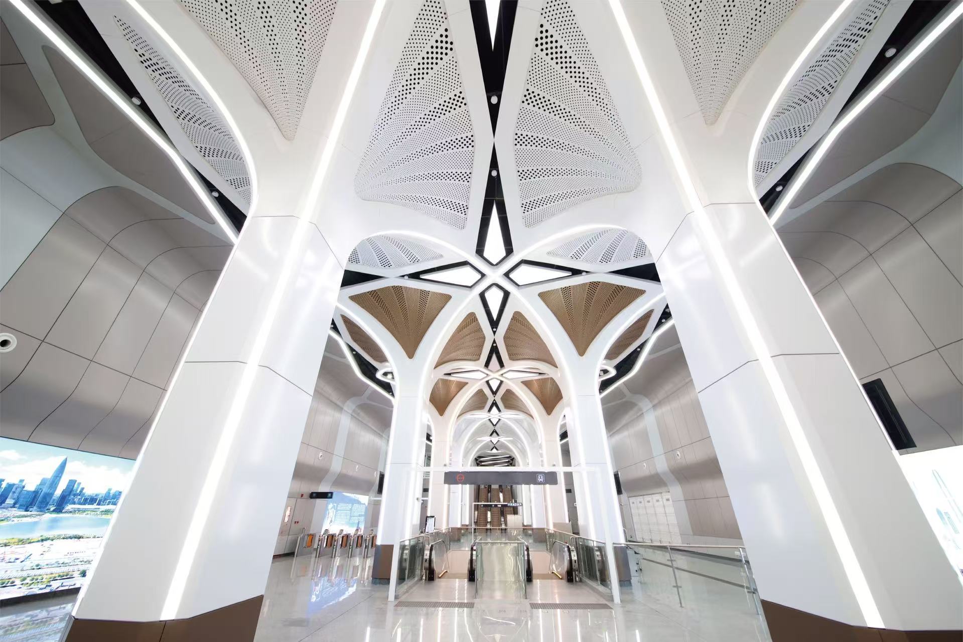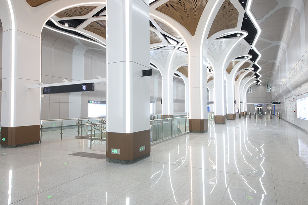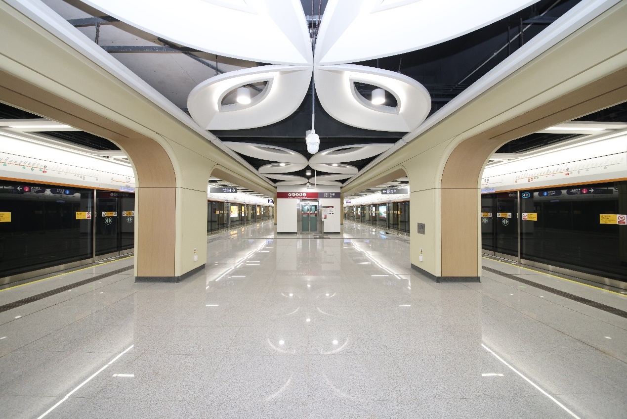 石岩站则毗邻石岩湿地公园和阳台山森林公园,车站设计从自然中汲取灵感,融入阳光、树叶等自然元素,天花模拟自然采光,搭配叶脉元素,将自然树木的质感与阳光透过树叶的意向相结合,使乘客在出行中感受自然意象与现代建筑的和谐。