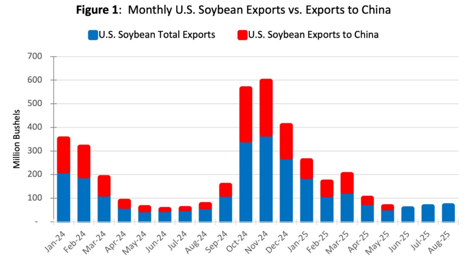 美国大豆月度出口与对华出口。截图自美国普渡大学9月发表论文,数据来自美农业部