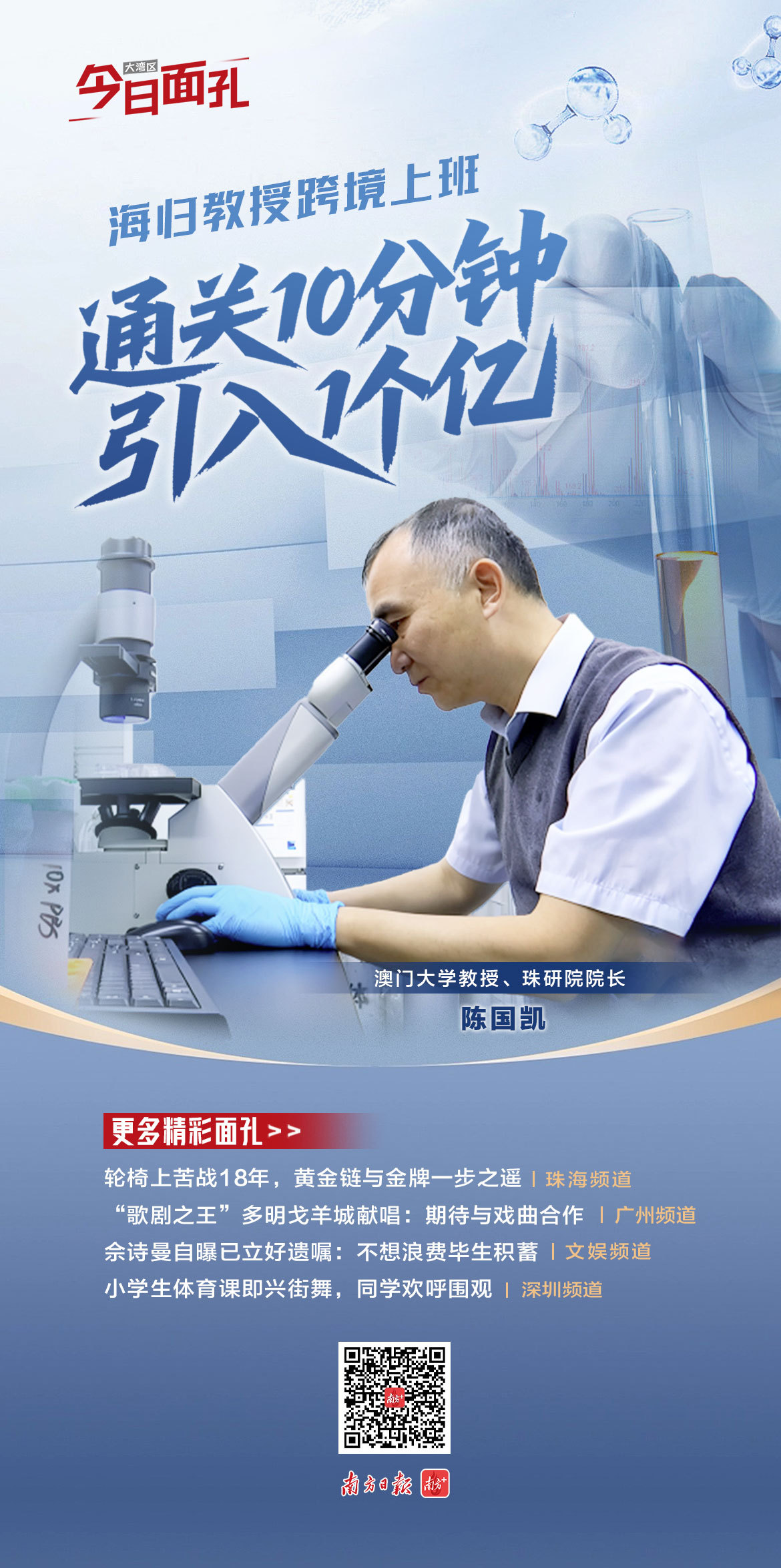 身兼澳大教授与珠研院院长的陈国凯,每天都需跨境上班。特别的是,他的跨境路只需10分钟车程——位于澳门的澳门大学和位于横琴的珠研院只隔一条马路。