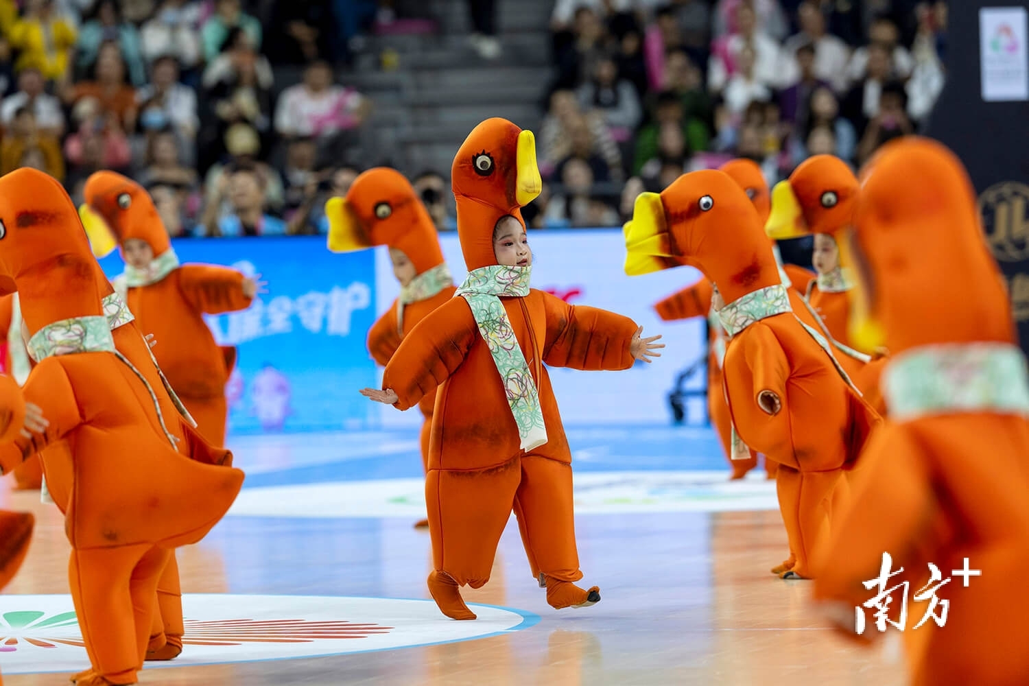 东莞赛区篮球比赛的中场表演上,一群萌哒哒“莞小鹅”火出了圈:打扮成烧鹅造型的小朋友们,以活泼的舞步复刻东莞烧鹅的制作过程。穿梭其间的“小厨师”,还在反复给“莞小鹅”刷上“酱汁”,憨态可掬的舞姿“萌”翻全场。