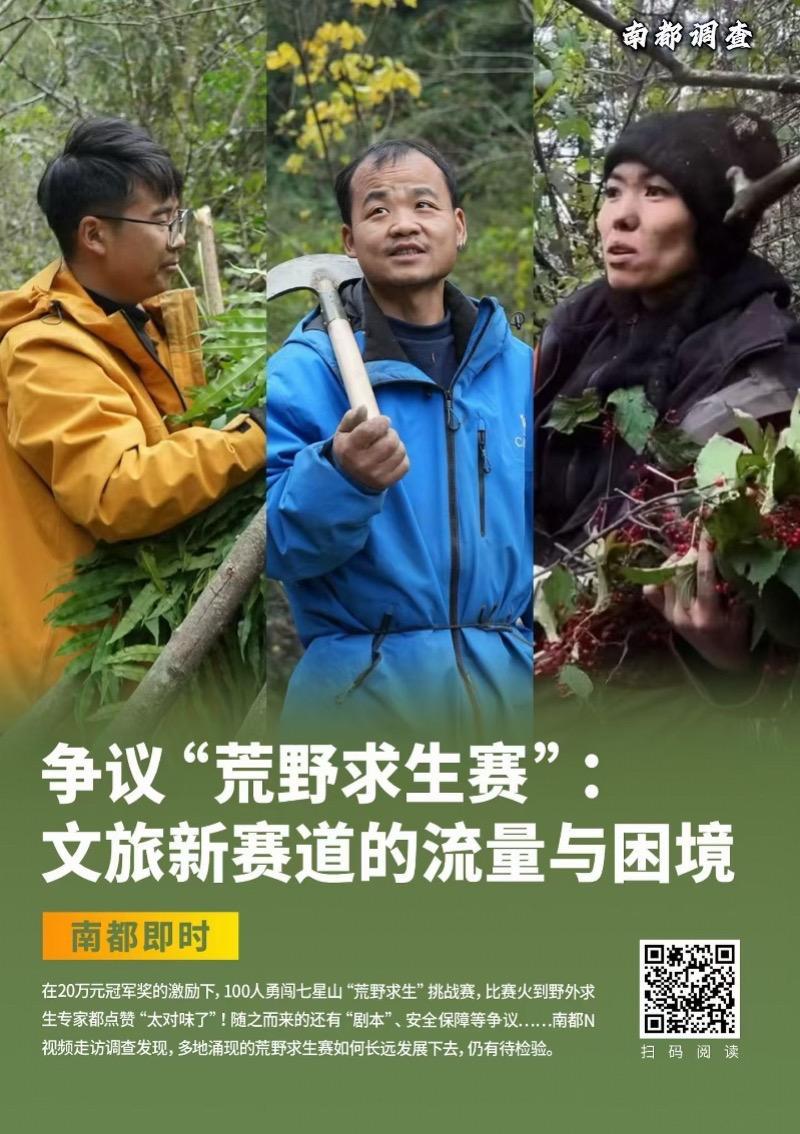 近期,南都记者走访调查发现,荒野求生赛爆火,以张家界七星山“荒野求生”挑战赛为例,在20万冠军奖金的激励下,4万人报名参赛,最终13人闯进决赛。