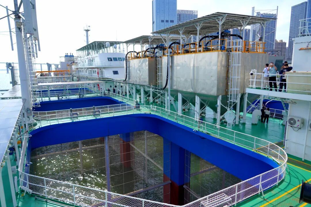 在各方见证下,实验室自主研发设计的全球首创漂浮式动力定位网箱型平台成功交付,标志着我国海水养殖从近海走向深远海的征程,迈出了坚实一步。