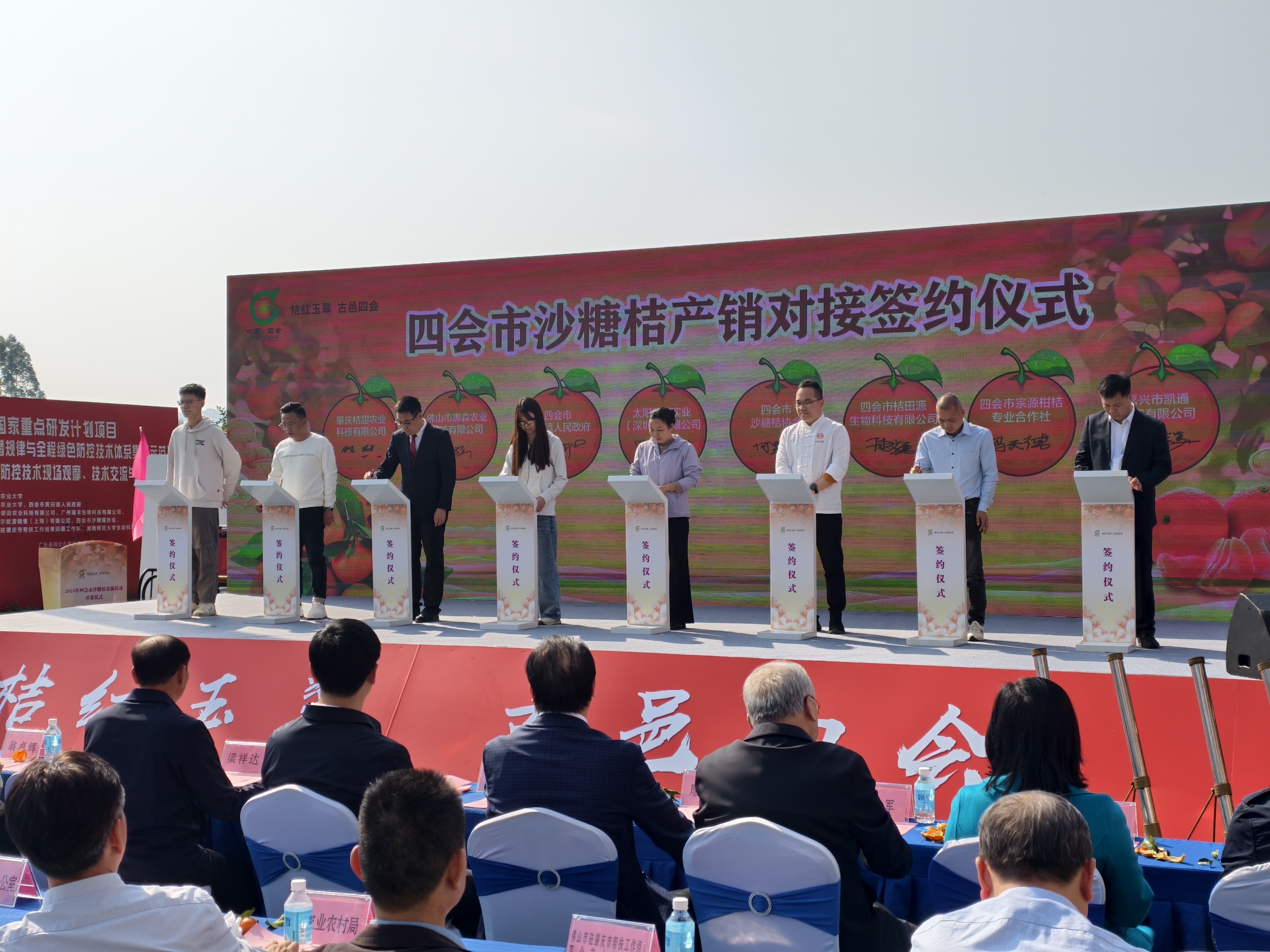 在产销对接签约仪式上,由四会市黄田镇人民政府、四会市沙糖桔协会、四会市宗源柑桔专业合作社、肇庆桔甜农业科技有限公司组成的产区签约代表,以及由太阳星禾实业(深圳)有限公司、嘉兴市凯通投资有限公司、佛山市惠森农业科技有限公司、四会市桔田源生物科技有限公司组成的销区签约代表,双方在友好和谐的氛围中进行了签约,为产销两端搭建起坚实的合作桥梁。