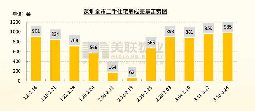 深圳二手房节后周周涨,但需要注意的是,持续上涨的动力或已经放缓。根据美联物业的数据,上周(3.18-3.24)全市二手住宅备案量达到985套,较前一周上升了2.7%。虽然备案量持续小幅增长,但增幅相比之前有所收窄。