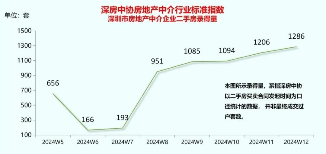 事实上,深圳二手房交易量近期一直持续涨势。据深圳市房地产中介协会发布的2024年第12周(3月18日-3月24日)周报显示,深圳全市二手房(含自助)录得1286套,环比增长6.6%。二手房周录得量呈现六连升,市场热度不减,3月“小阳春”行情已成定势。(录得量,系指深房中协以二手房买卖合同发起时间为口径统计的数据,并非最终成交过户套数。)
