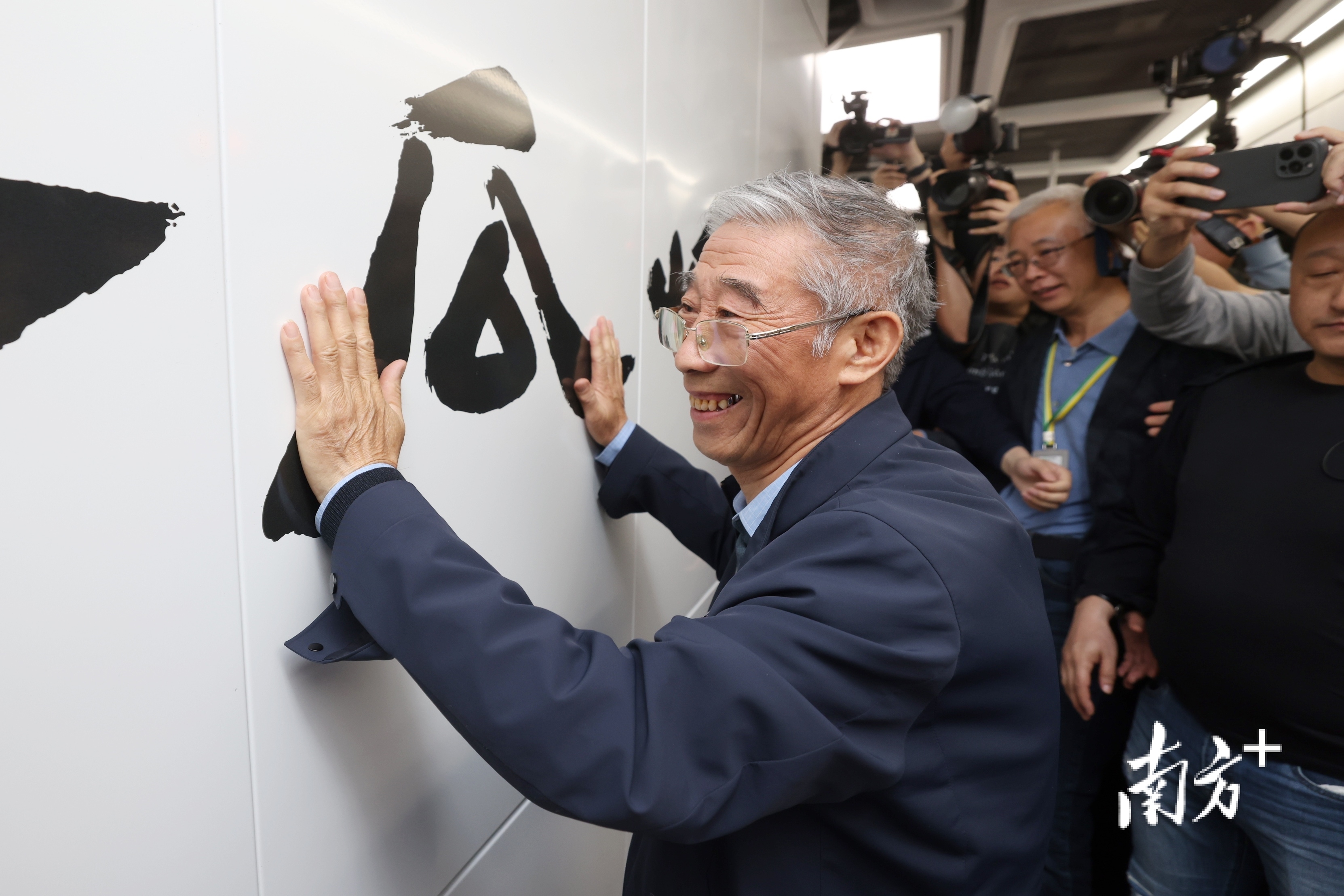 岗厦北枢纽的景观设计冠绝10号线,“深圳之眼”的造型使其有着地铁“颜值天花板”的美誉。参观中,王朝珠不时啧啧称奇,随后兴之所至,在宣纸上写下“情满鹏城”四字,并拿出印章盖上,现场笔墨飘香。