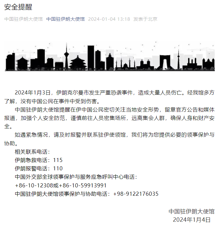 2024年1月4日,中国驻伊朗大使馆发布安全提醒,提醒在伊中国公民密切关注当地安全形势,加强个人安全防范。声明称,2024年1月3日,伊朗克尔曼市发生严重恐袭事件,造成大量人员伤亡。经中国驻伊朗大使馆多方了解,没有中国公民在事件中受到伤害。
