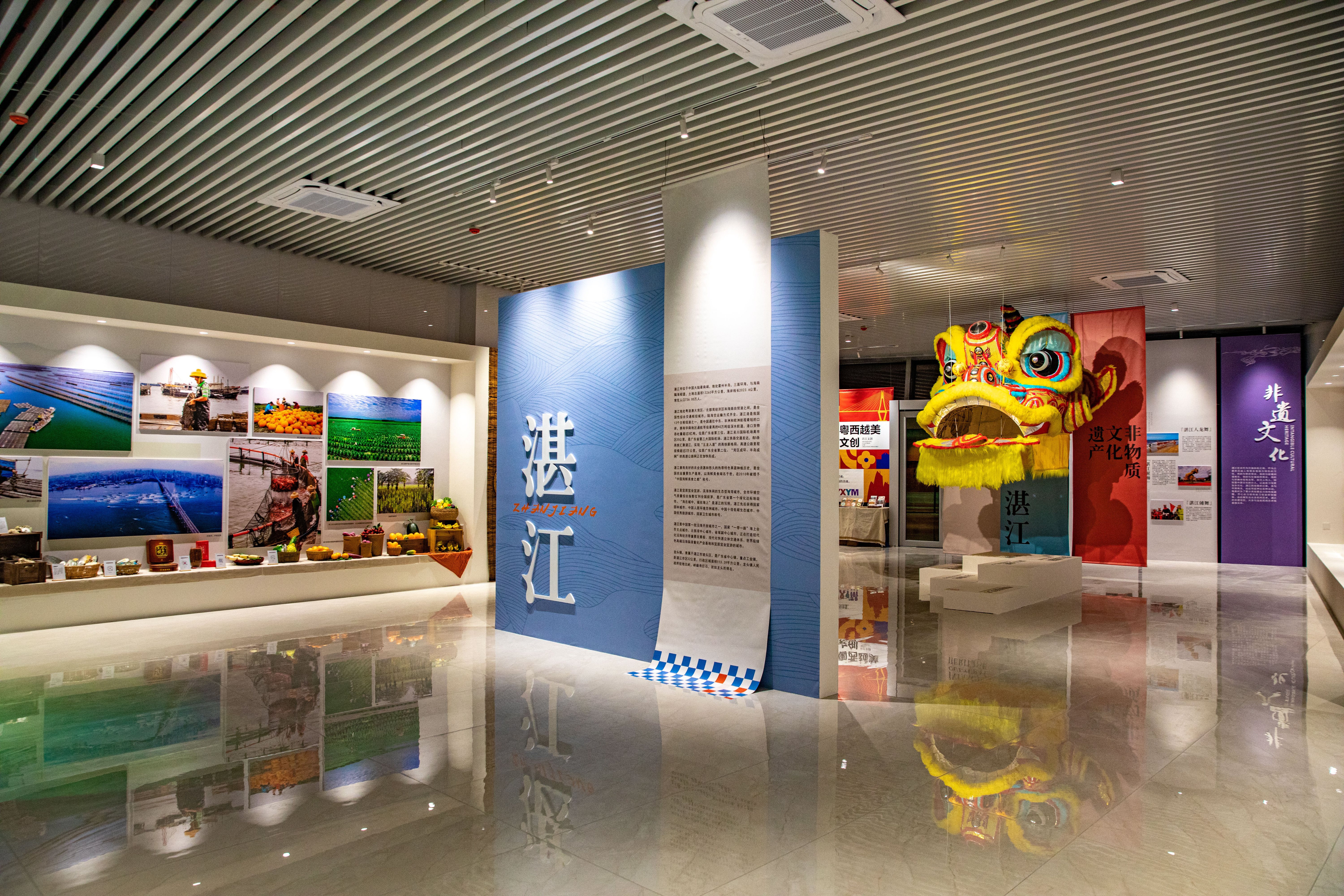 为了展现“魅力湛江”,龙头服务区内部打造了“岭南特色+海洋文化”的湛江文化主题馆,馆内设置了广东醒狮文化、湛江特色农产品、非物质文化图片展、人文史脉图片展、文创作品展等内容,通过历史、人文、地理、资源等方面,全方位展示了湛江宜居宜业宜游、滨海休闲的生态型海湾城市形象。