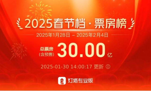 据网络平台数据,截至1月30日14时,2025年春节档档期总票房(含预售)破30亿!再创新高!2025年1月30日15时32分,2025年度票房(含预售实时)破50亿!详情>>