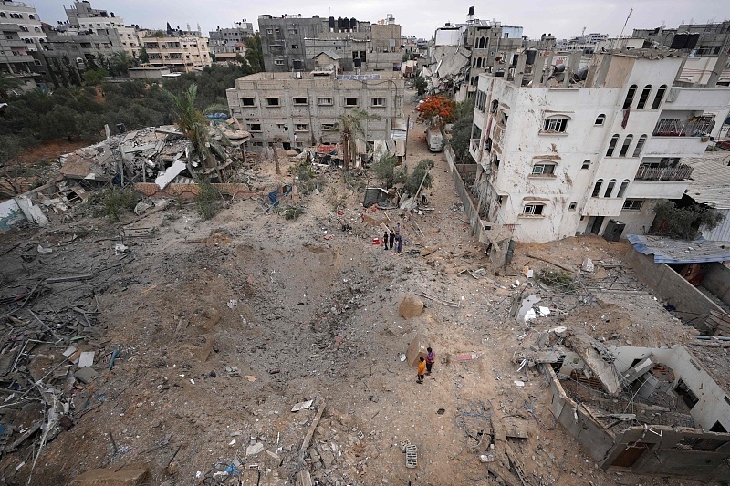 △当地时间6月3日,加沙地带中部,民众检查遭空袭后的废墟。