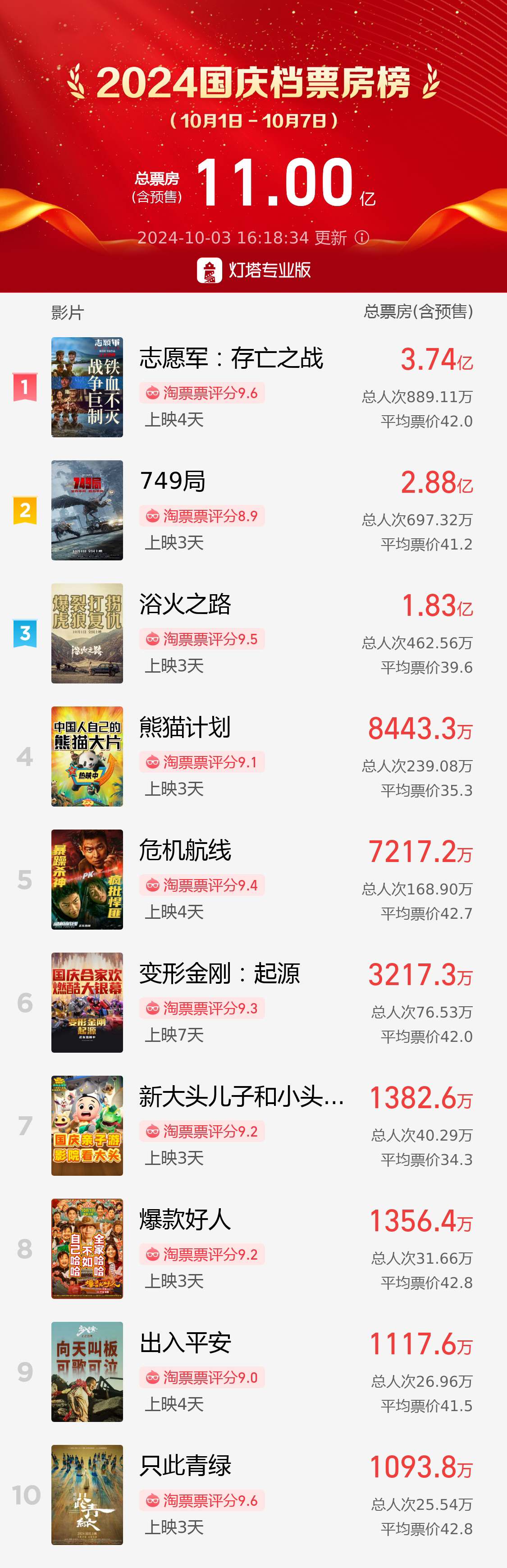 据网络平台数据,截至10月3日16时18分,2024年国庆档(10月1日—10月7日)档期内总票房(含预售)突破11亿。