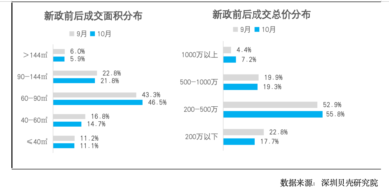 深圳贝壳研究院统计显示,新政后60-90㎡的房源成交占比明显扩大,达到46.5%,这印证了政策放松所呈现的一贯规律:市场回暖,刚需先行。