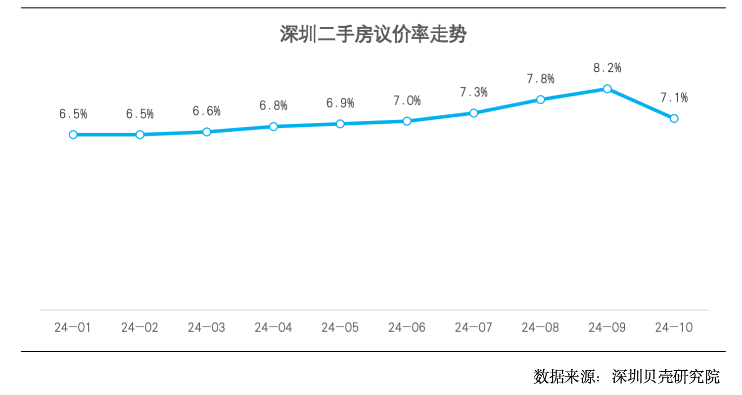 据深圳贝壳研究院监测,今年1-9月深圳二手房市场议价率呈现稳中有升的趋势,其中9月达到今年以来最高值,不过新政的利好有助于提升买卖双方信心、带动整体市场热度回升,对各个区域的成交产生了一定的积极影响,因此业主议价空间有所减少,其中10月议价率为7.1%,环比缩小1.1%。